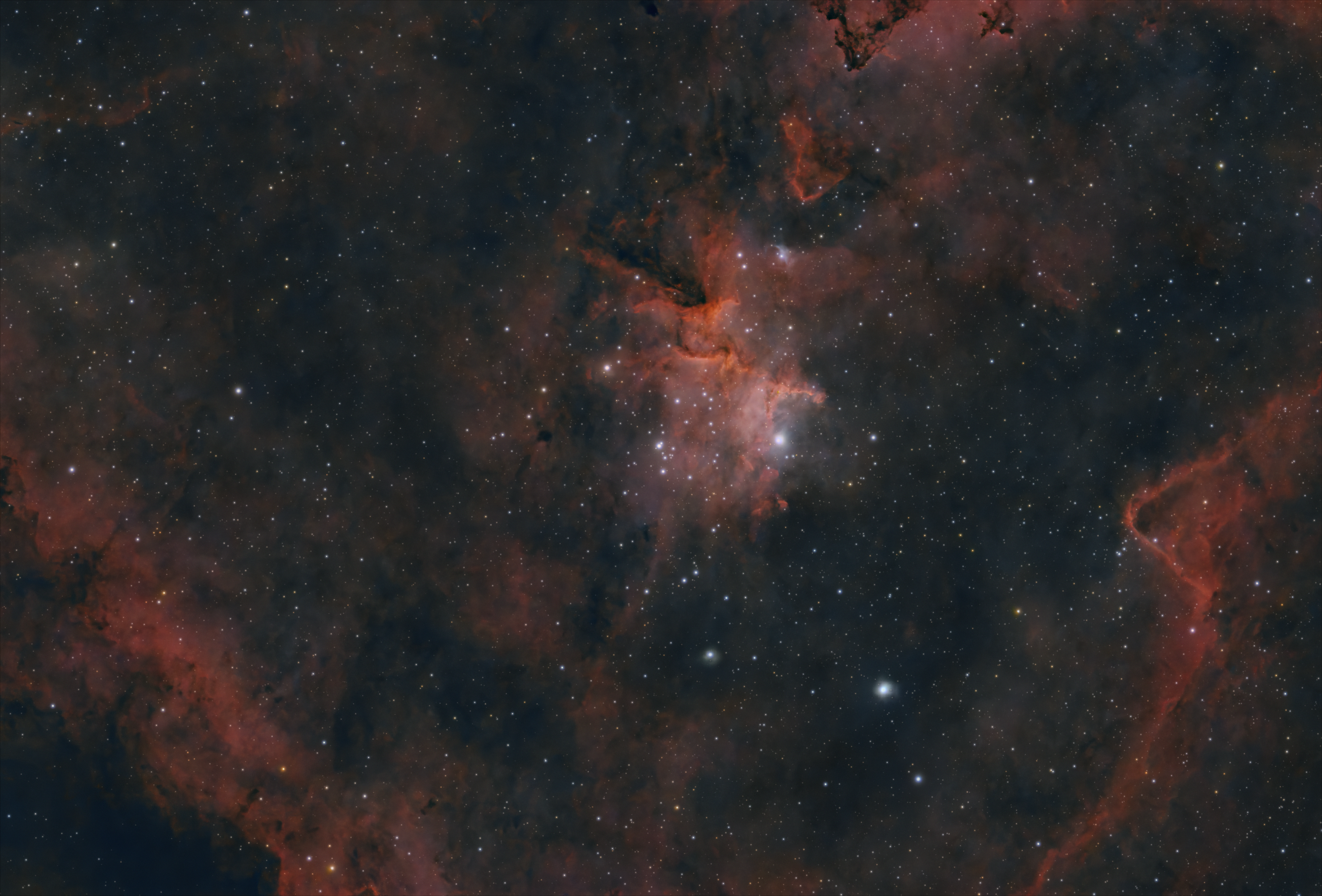Der Herznebel (IC 1805) ist eine riesige H-II-Region im Sternbild Kassiopeia, etwa 7.500 Lichtjahre von der Erde entfernt. Seine markante Form entsteht durch komplexe Wechselwirkungen zwischen jungen massereichen Sternen und den ihn umgebenden Gas- und Staubwolken. Im Zentrum des Nebels befindet sich der offene Sternhaufen Melotte 15, der mehrere extrem heiße und junge Sterne beherbergt. Diese massereichen Sterne senden starke Sternwinde und energiereiche Strahlung aus, welche die umgebenden Wasserstoffgaswolken ionisieren und sie zum Leuchten anregen. Die dunklen Staubbänder, die sich durch den Nebel ziehen, sind dichte Regionen aus interstellarer Materie, in denen zukünftige Sternentstehung stattfinden kann. Der Herznebel hat eine Ausdehnung von etwa 200 Lichtjahren und erscheint am Himmel mit einer Größe von fast 2 Grad, was vier Vollmonddurchmessern entspricht. Aufgrund seiner schwachen Leuchtkraft ist er visuell nur unter sehr dunklem Himmel sichtbar, doch in der Astrofotografie offenbart sich seine beeindruckende Struktur und Farbgebung. Besonders durch Schmalbandfilter, die das Licht von ionisiertem Wasserstoff (Hα), Sauerstoff (OIII) und Schwefel (SII) isolieren, lässt sich die wahre Schönheit dieses kosmischen Kunstwerks einfangen.