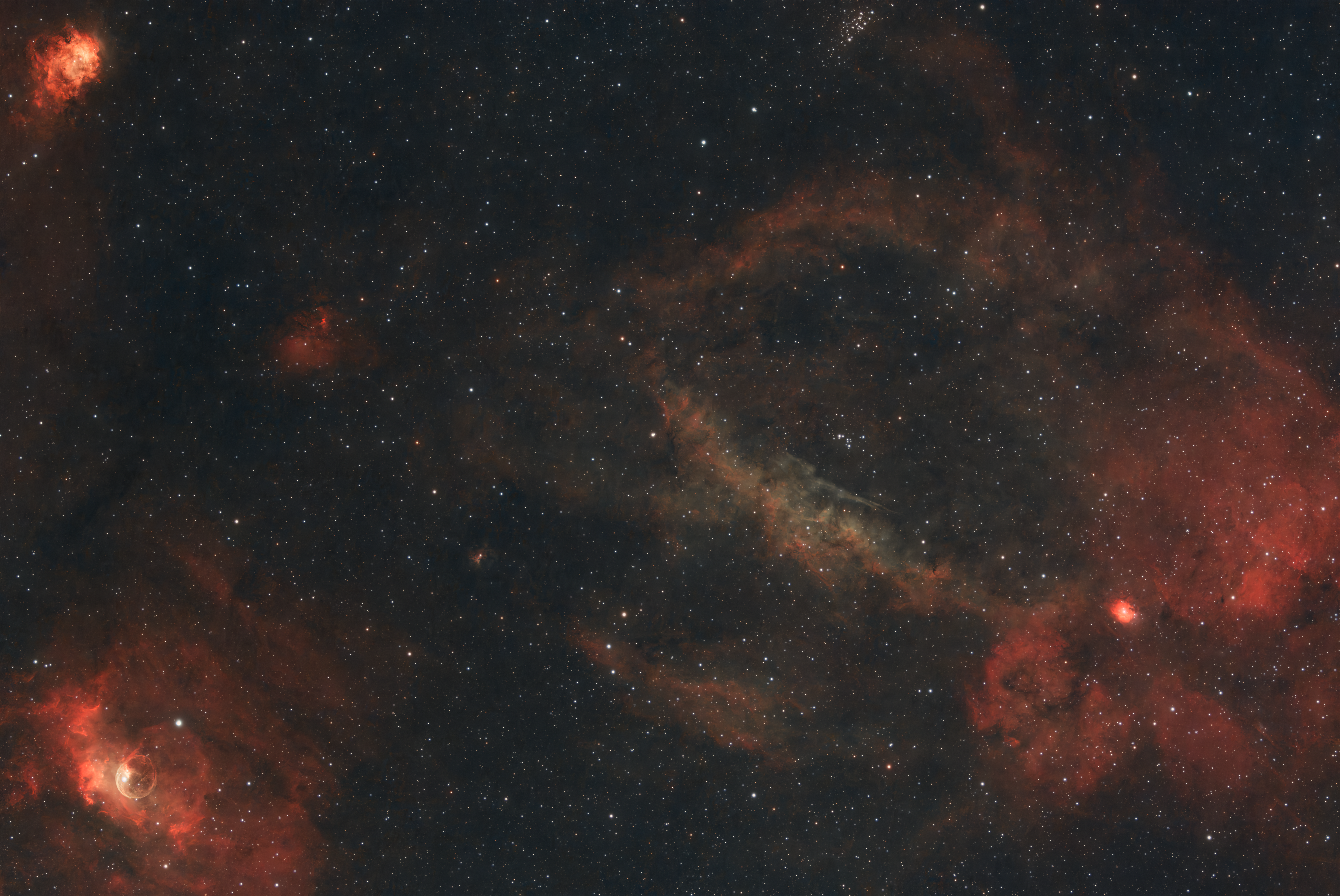 Trotz des aufziehenden Nebels nach nur 2h zeigt sich bereits die große Vielfalt dieser Region – von den hellen ionisierten Gasfronten über die filamentartigen Strukturen bis hin zu den dunklen Staubschwaden, die den Blick in die Tiefe der Milchstraße nur teilweise freigeben.
