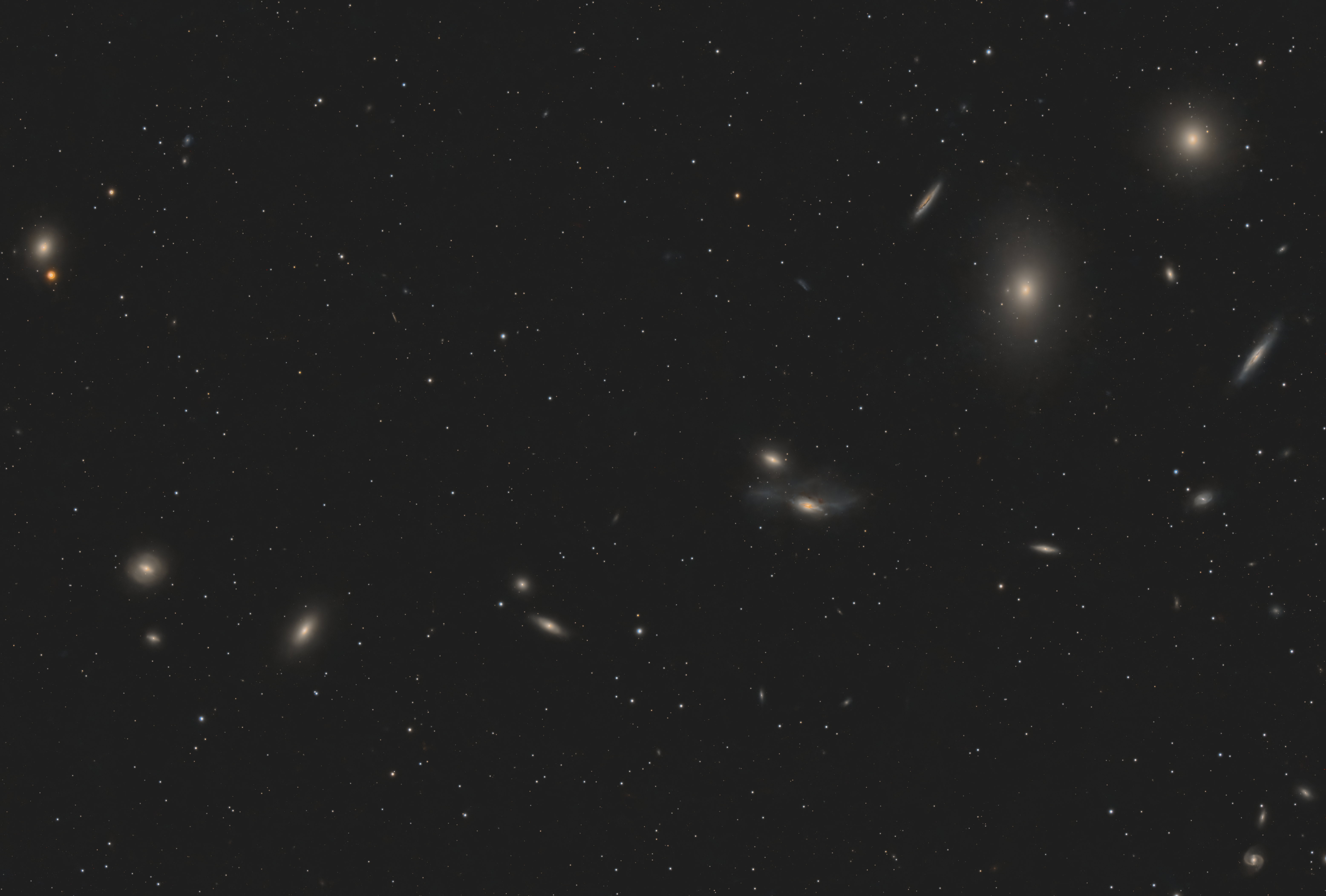 Die Markarjan'sche Kette ist eine auffällige Ansammlung von Galaxien im Virgo-Galaxienhaufen, etwa 50 bis 60 Millionen Lichtjahre von der Erde entfernt. Benannt wurde sie nach dem armenischen Astrophysiker Benjamin Markarjan, der als erster auf die ungewöhnliche Anordnung dieser Galaxien aufmerksam wurde. Die bekanntesten Mitglieder der Kette sind die Galaxien M84, M86 sowie die wechselwirkenden Galaxien NGC 4438 und NGC 4435, auch bekannt als "Die Augen". Die Galaxien der Kette erscheinen durch ihre scheinbar aufgereihte Position wie an einer unsichtbaren Perlenkette aufgezogen, auch wenn sie sich in Wirklichkeit in leicht unterschiedlichen Entfernungen befinden. In der Aufnahme lassen sich zahlreiche Details erkennen: von elliptischen Riesengalaxien über Spiralstrukturen bis hin zu intergalaktischen Staubspuren – ein eindrucksvolles Beispiel für die Vielfalt und Dynamik im Universum.