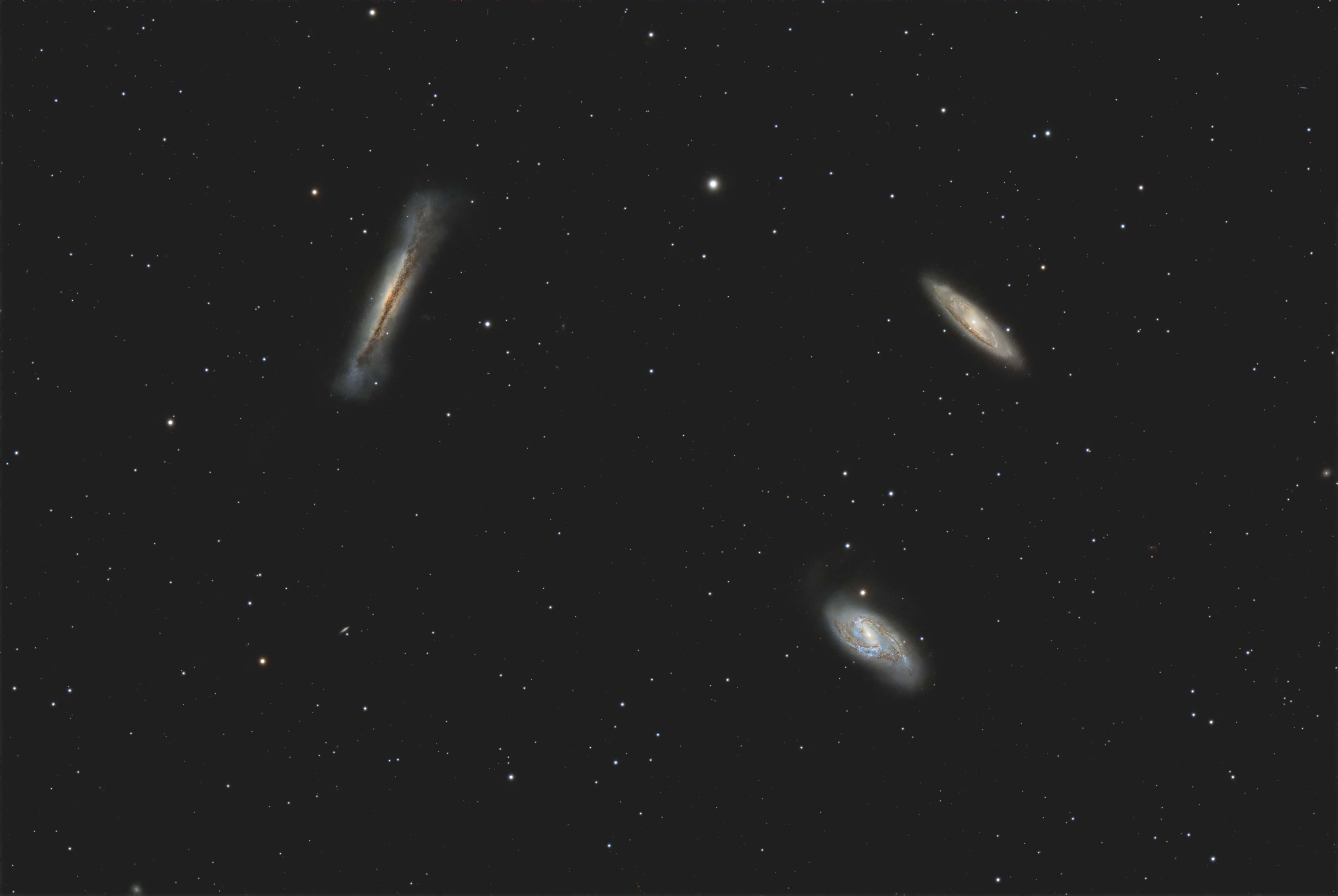 Das sogenannte Leo-Triplet, bestehend aus den Galaxien M65, M66 und NGC 3628, befindet sich im Sternbild Löwe und gehört zu den bekanntesten Galaxiengruppen des Frühlingshimmels. In einer Entfernung von rund 30 bis 35 Millionen Lichtjahren bilden die drei Systeme eine gravitativ gebundene Einheit, die sich durch ihre unterschiedlichen Erscheinungsformen besonders eindrucksvoll präsentiert.