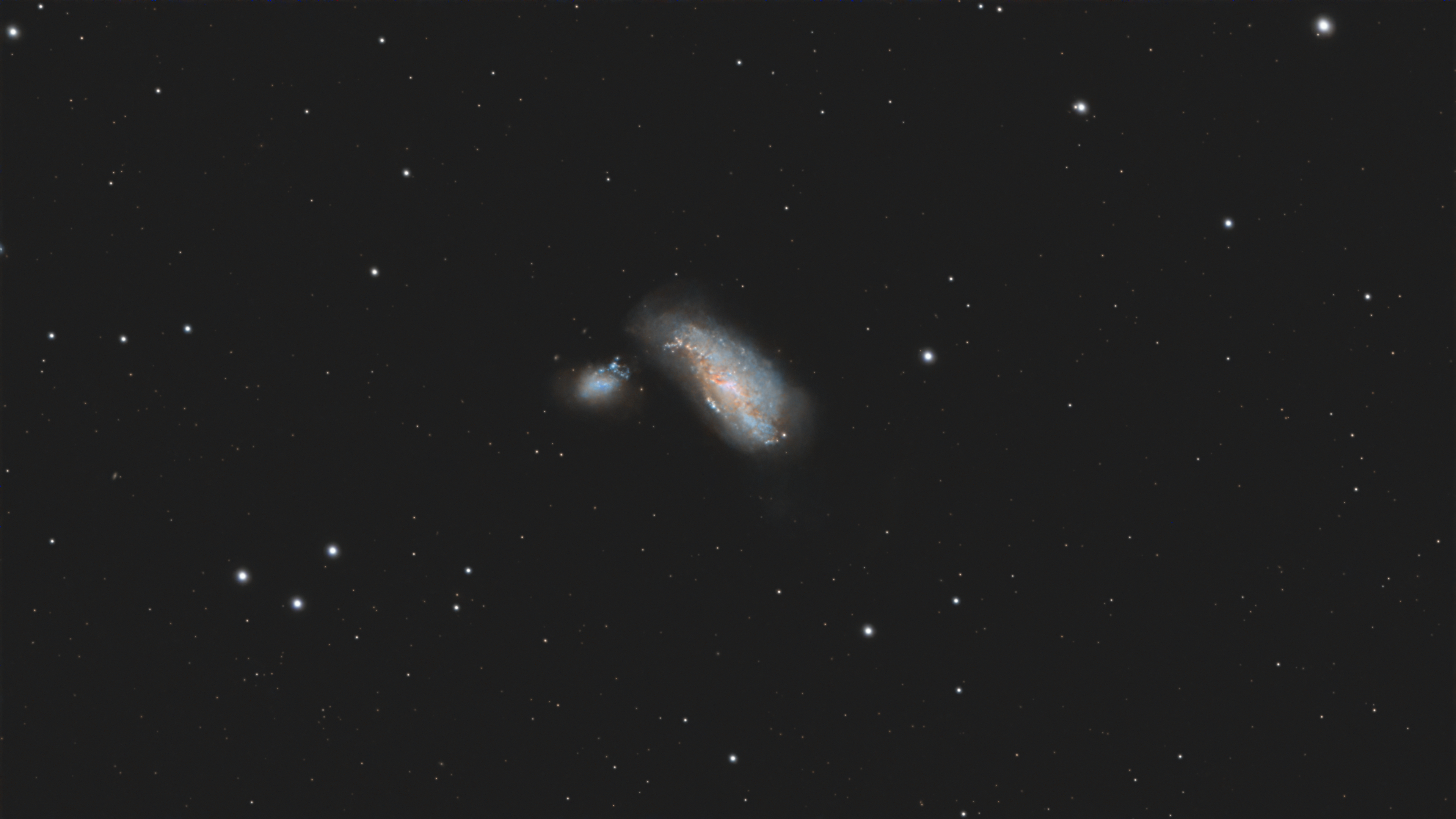 NGC 4490, oft auch als „Cocoon Galaxy“ bezeichnet, ist eine irreguläre Spiralgalaxie im Sternbild Jagdhunde (Canes Venatici). Gemeinsam mit ihrer kleineren Begleitgalaxie NGC 4485 bildet sie ein wechselwirkendes System, dessen Dynamik in dieser Aufnahme gut erkennbar ist. Durch die gravitative Wechselwirkung wurden große Mengen an Gas und Staub umverteilt, was zu intensiver Sternentstehung geführt hat – sichtbar in den bläulichen Bereichen sowie den rötlich leuchtenden Wasserstoffregionen.