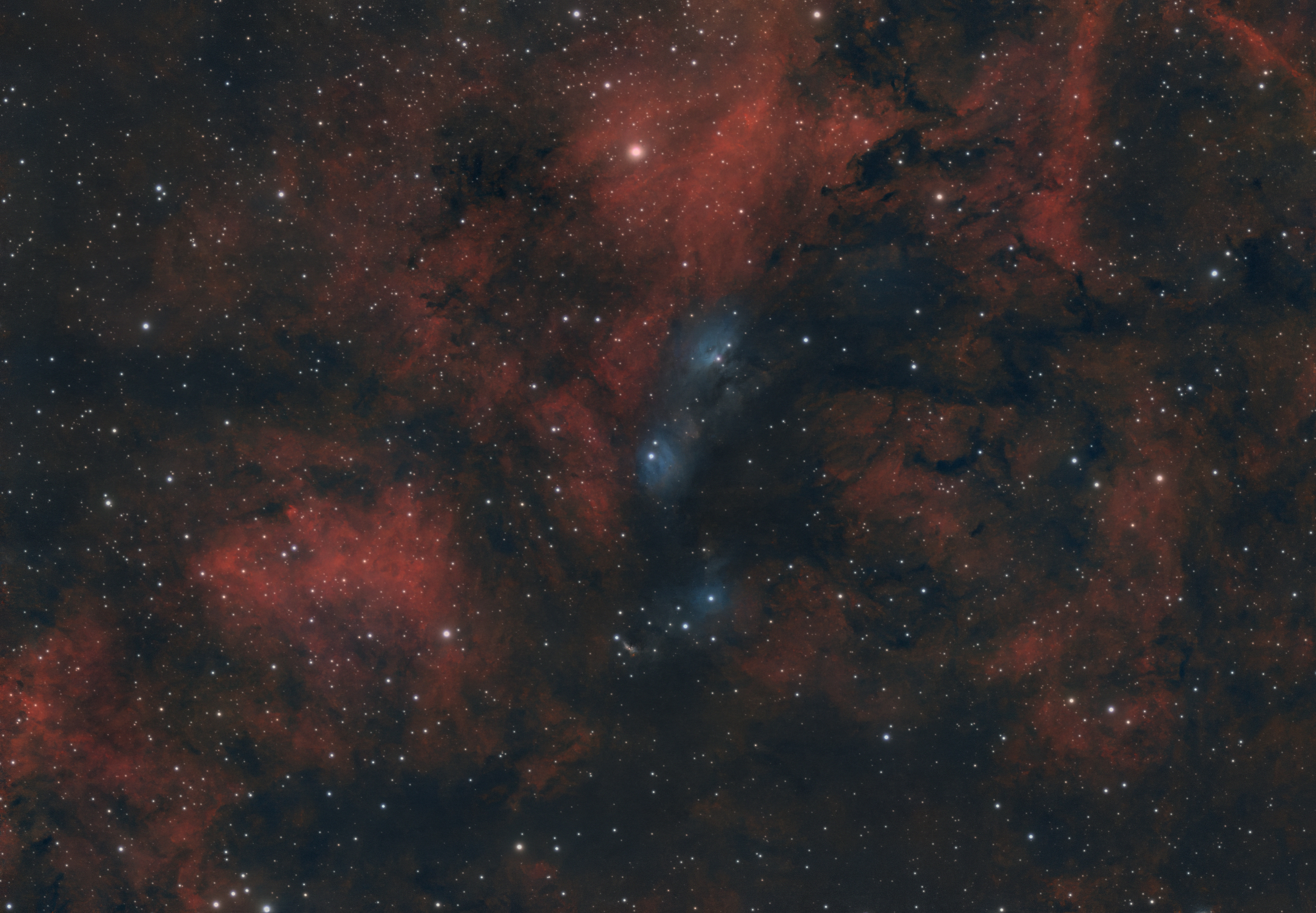 Diese Aufnahme zeigt die spektakuläre Umgebung des Reflexionsnebels NGC 6914, eingebettet in eine dichte Region der Milchstraße im Sternbild Schwan. Dominant sind die rötlich leuchtenden Emissionen ionisierten Wasserstoffs (Hα), durchsetzt von dunklen Staubbändern, die dem Bild Tiefe und Struktur verleihen. Besonders ins Auge fällt der bläuliche Reflexionsnebel, der durch das gestreute Licht junger, heißer Sterne entsteht – ein seltener Kontrast im Vergleich zu den sonst warm dominierten H-II-Regionen. Die Daten für dieses Bild stammen bereits aus dem Sommer 2024 und lagen zunächst zurückgestellt. Erst jetzt – mit frischem Blick und etwas Zeit – wurden sie neu bearbeitet und fertiggestellt. Dabei lag der Fokus auf natürlicher Farbdarstellung, der Erhaltung feiner Staubdetails und einem möglichst authentischen Bildeindruck, der der Vielfalt dieser Himmelsregion gerecht wird.