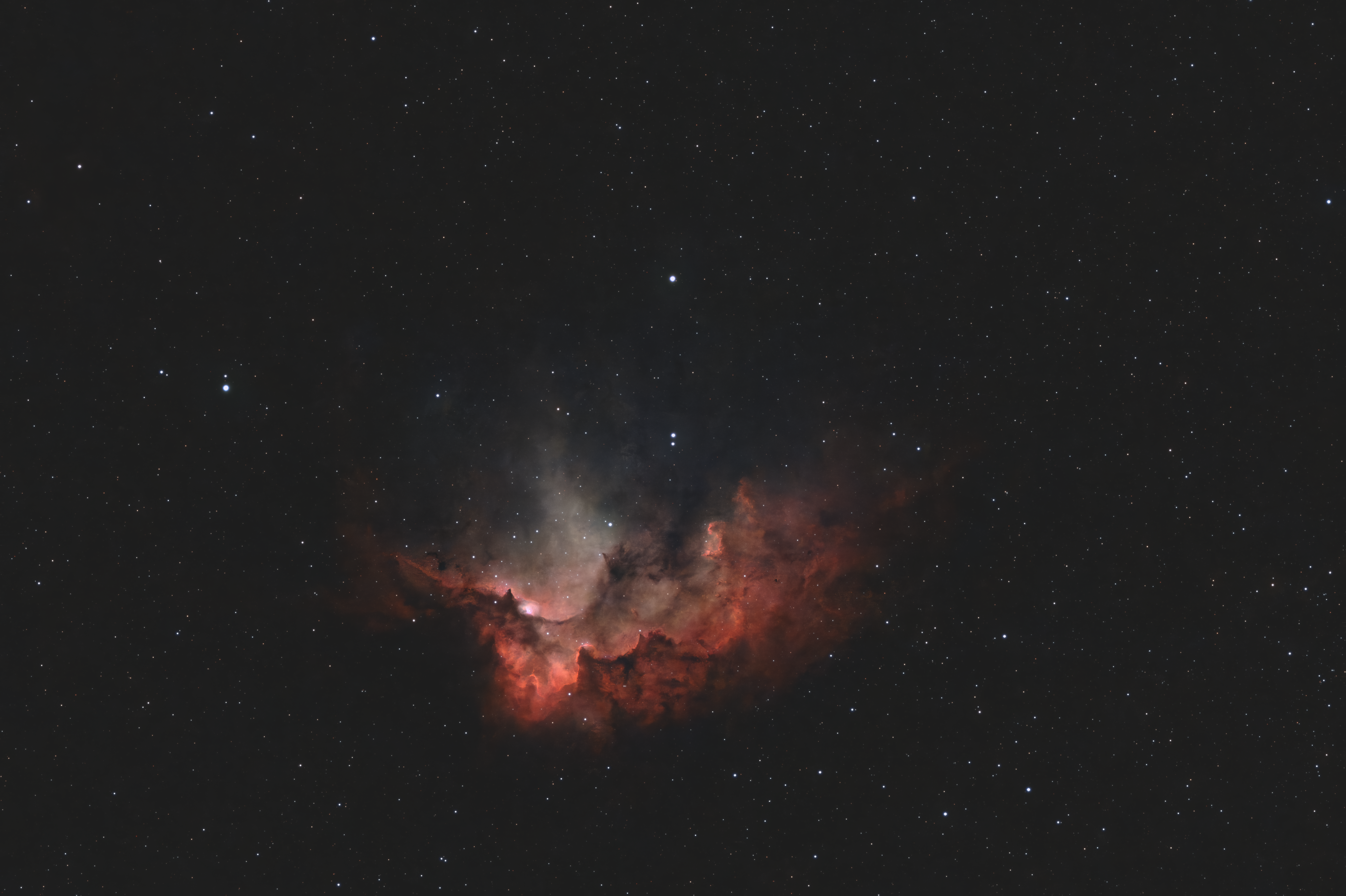 Diese Aufnahme entstand unter ungünstigen Bedingungen bei fast vollem Mond. Mit einem Quadbandfilter und der Farbastro-Kamera ASI2600MC konnten dennoch die wichtigsten Emissionslinien (Hα und O III) herausgearbeitet und im Bild kombiniert werden. Durch sorgfältige Hintergrundkalibrierung, Farbneutralisation und selektive Kontrastverstärkung wurden schwache Strukturen sichtbar gemacht, ohne den natürlichen Charakter zu verlieren.