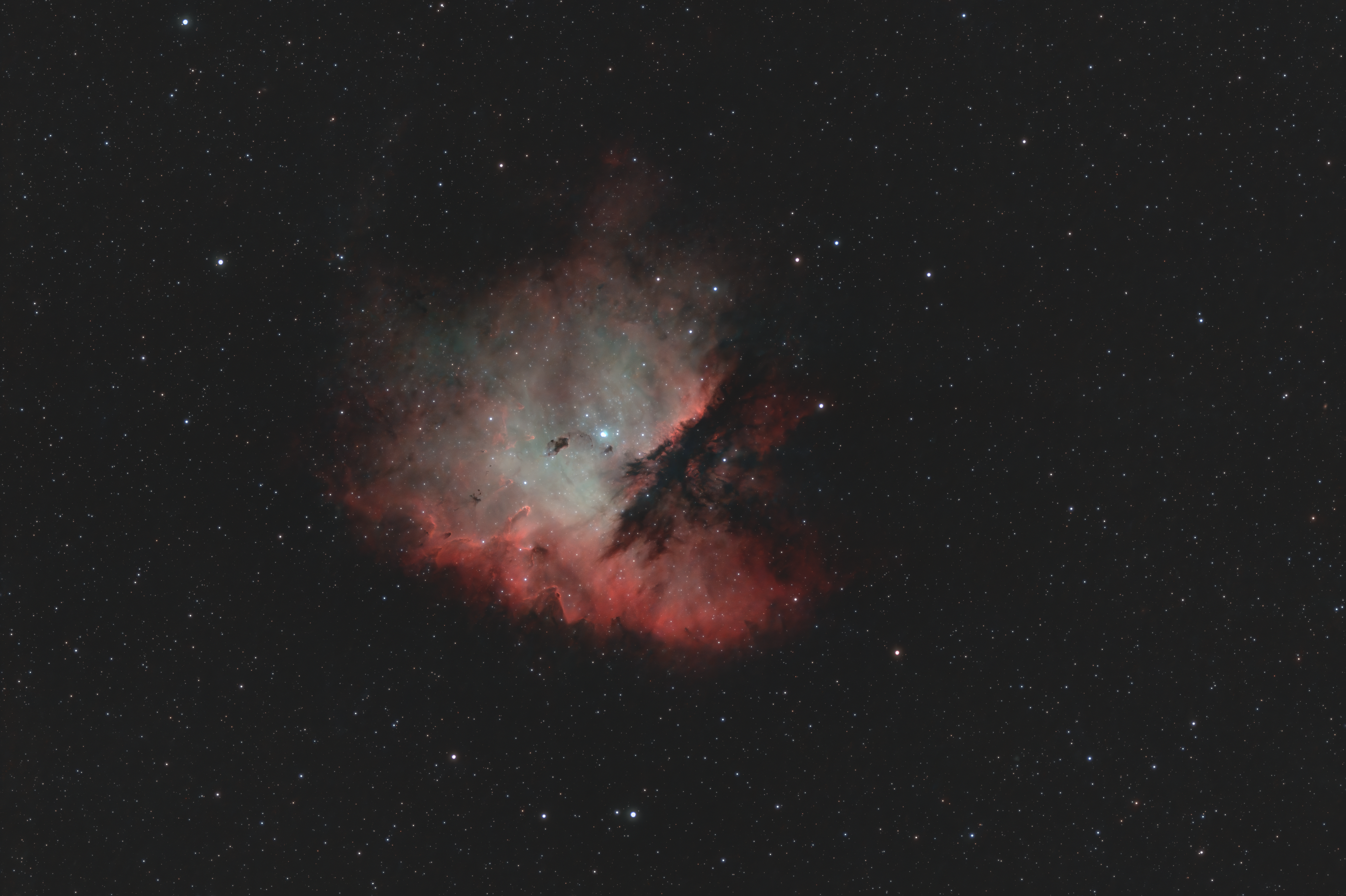 NGC 281, etwa 9.500 Lichtjahre entfernt, liegt im Perseus-Arm unserer Milchstraße. Sein charakteristisches Erscheinungsbild verdankt er dem Kontrast zwischen dem rot leuchtenden Wasserstoffgas (Hα-Emission), dunklen Staubwolken und den hellen Sternen des eingebetteten offenen Sternhaufens IC 1590.