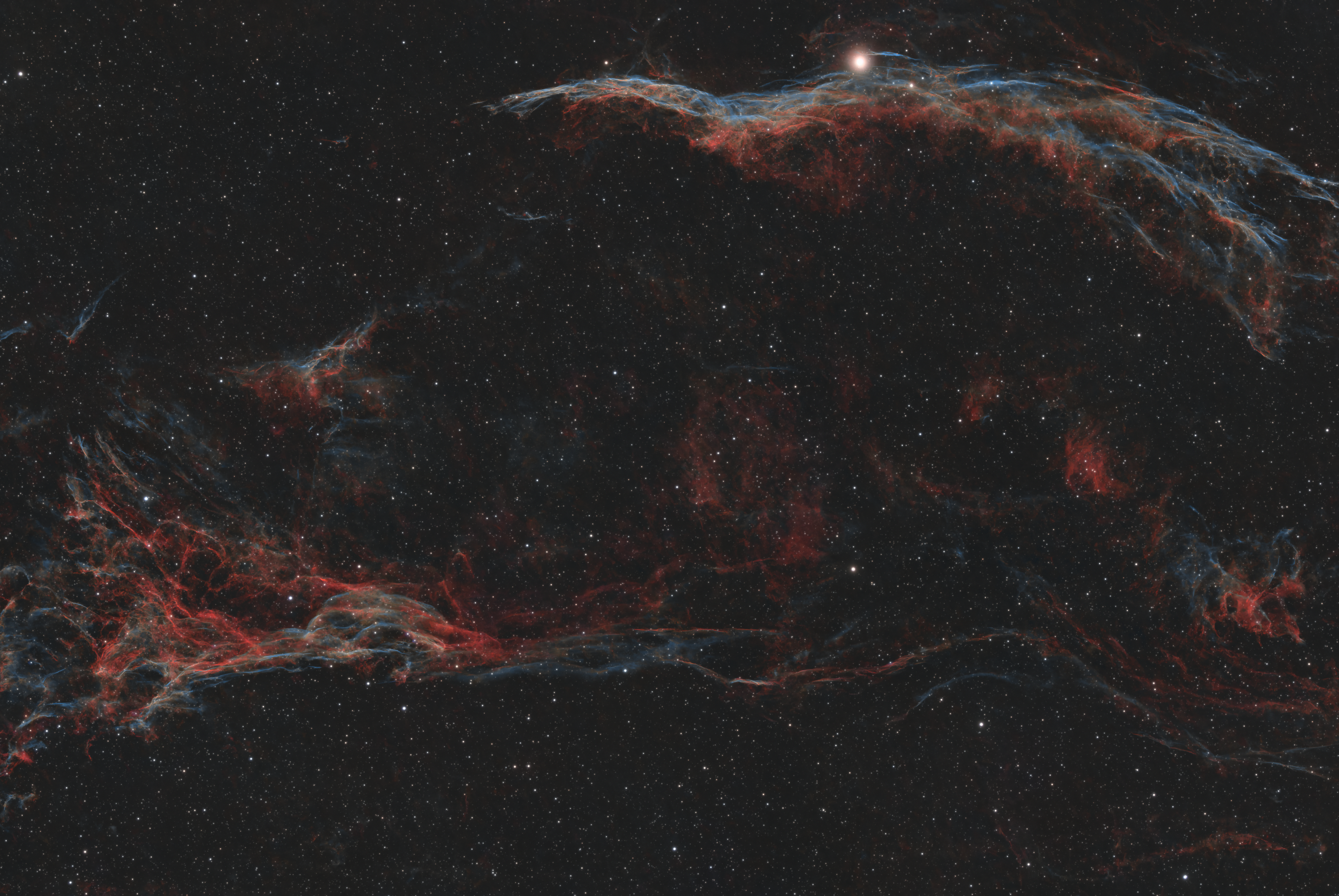 Der Schleiernebel (NGC 6960) ist Teil des großen Cygnus-Schleiers, eines Überrests einer gewaltigen Supernovaexplosion vor etwa 10.000 bis 20.000 Jahren im Sternbild Schwan. Der hier gezeigte Abschnitt, oft als "Sturmvogel" oder "Witch's Broom" bezeichnet, bildet die westliche Flanke dieser riesigen Struktur, die sich über mehr als 3 Grad am Himmel erstreckt – das entspricht etwa sechs Vollmonddurchmessern. Die sichtbaren filigranen Filamente bestehen aus ionisiertem Wasserstoff (rötlich) und Sauerstoff (bläulich), die durch die Stoßwellen des explodierten Sterns angeregt wurden. Die ursprüngliche Supernova war so energetisch, dass sie eine Hülle aus Gas in alle Richtungen schleuderte. Diese Hülle trifft noch heute mit Überschallgeschwindigkeit auf die interstellare Materie – der "Schleier" ist somit das Echo eines gewaltigen Endes. Besonders faszinierend ist der Kontrast zwischen den scharfen, bogenförmigen Kanten des Stoßfronts und den diffusen, zerfaserten Nebelteilen – sie zeigen, wie sich das Gas in den unterschiedlich dichten Regionen des Alls bewegt und verteilt hat. Einige dieser Strukturen sind nur wenige Lichtjahre dünn, obwohl der gesamte Komplex etwa 2.400 Lichtjahre entfernt ist und rund 130 Lichtjahre misst. Dieses Bild wurde mit einer Farbkamera und einem Antlia-Filter aufgenommen, der gezielt H-alpha und OIII isoliert – dadurch erscheinen die Farben zwar künstlerisch überhöht, spiegeln aber reale physikalische Prozesse wider.