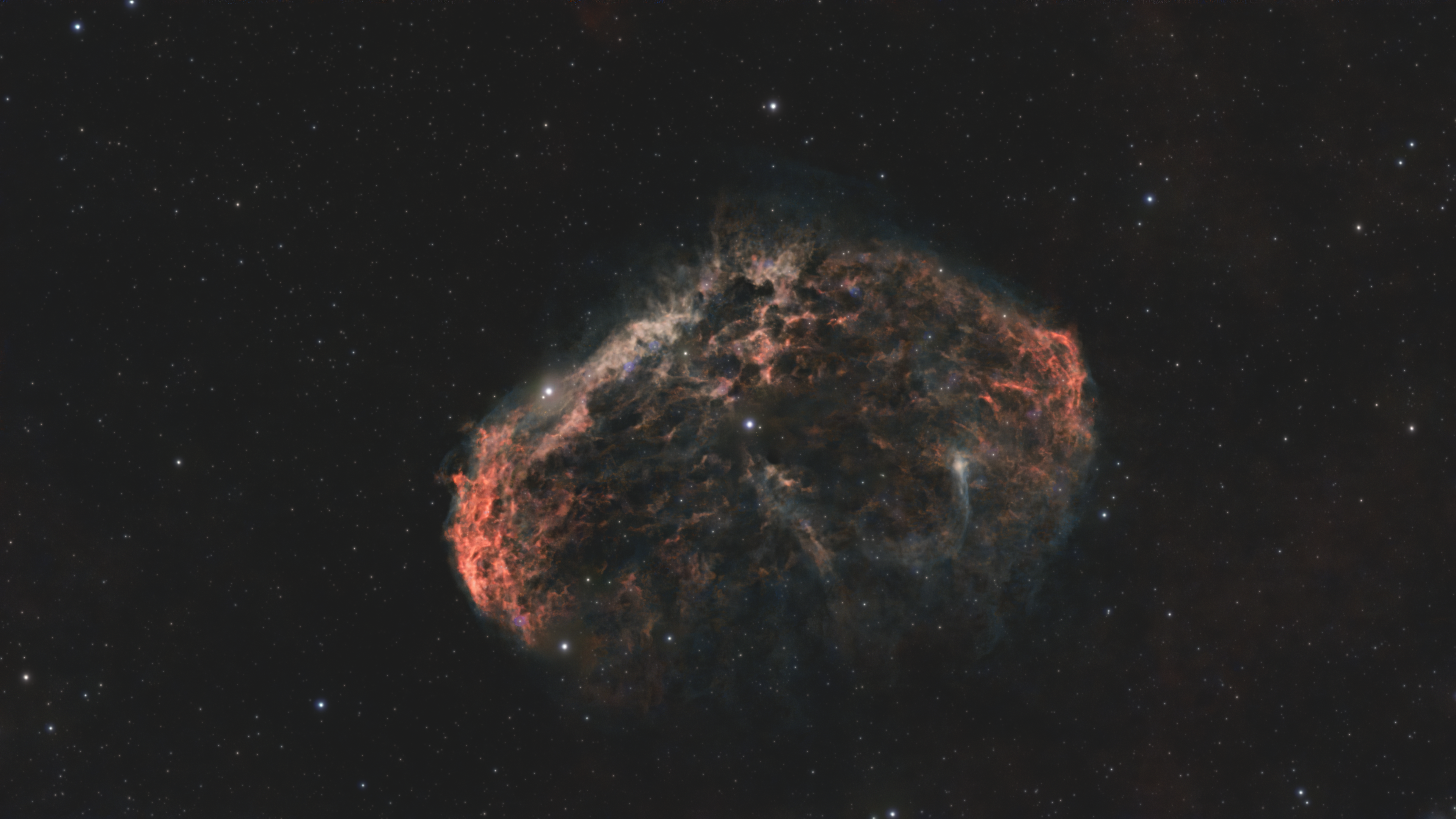 NGC 6888, auch bekannt als Crescent Nebula oder Mondsichelnebel, ist ein Emissionsnebel im Sternbild Cygnus. Er entstand durch das Zusammenspiel extremer Sternwinde des zentralen Wolf-Rayet-Sterns WR 136, der seine äußeren Hüllen abgestoßen hat und auf zuvor abgestoßenes Material trifft. Die dadurch entstehenden Stoßfronten formen die charakteristischen bogenförmigen Strukturen. Dieses Bild wurde mit einem Antlia Quad Band Filter aufgenommen, der gezielt die Emissionen von Hα, OIII und SII isoliert. Der rot leuchtende Bereich stammt hauptsächlich aus Wasserstoffemissionen, während grünlich-bläuliche Strukturen durch doppelt ionisierten Sauerstoff (OIII) entstehen. Die spektroskopische Farbkalibrierung gewährleistet eine naturgetreue Darstellung der Emissionslinien, ohne übertriebene Falschfarbeneffekte. Die feinen Details in den Randzonen bleiben erhalten, unterstützt durch ein mehrstufiges HDR-Stretching und moderate Entrauschung.